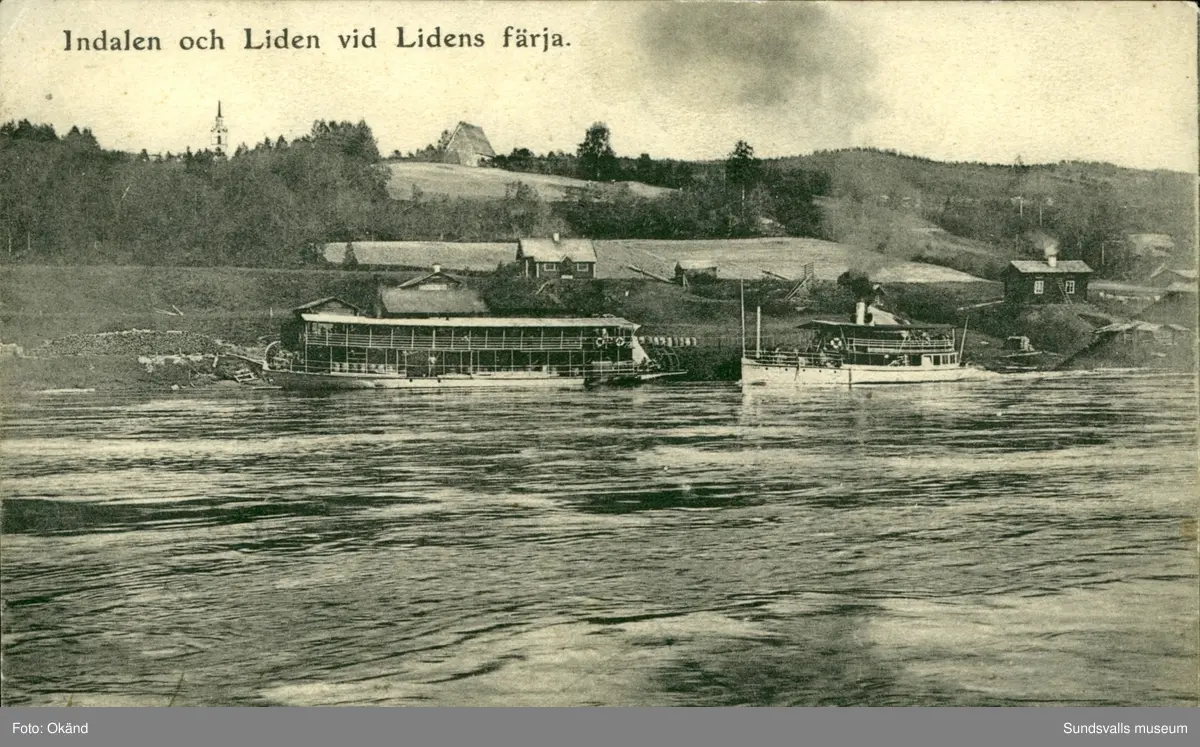 Vykort med motiv över ångbåtarna Indal och Liden som lagt till vid Lidens färjeläger.