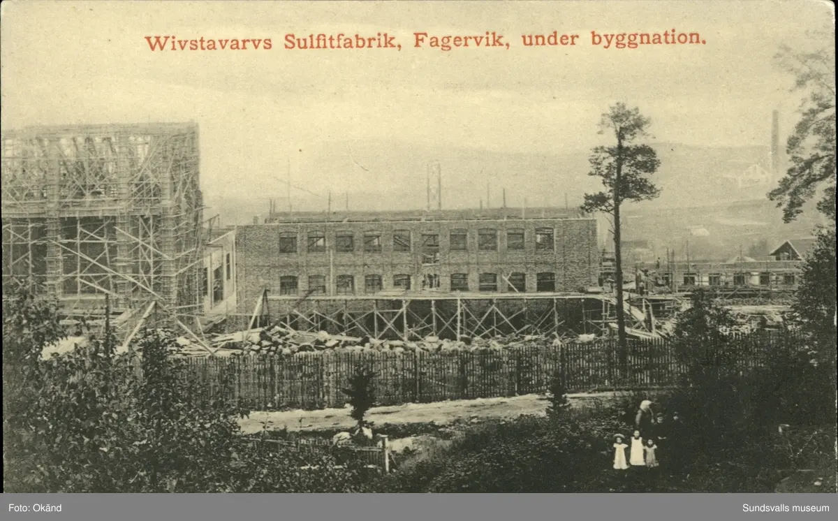 Vykort med motiv över Vivstavarvs Sulfitfabrik i Fagervik under uppbyggnad.