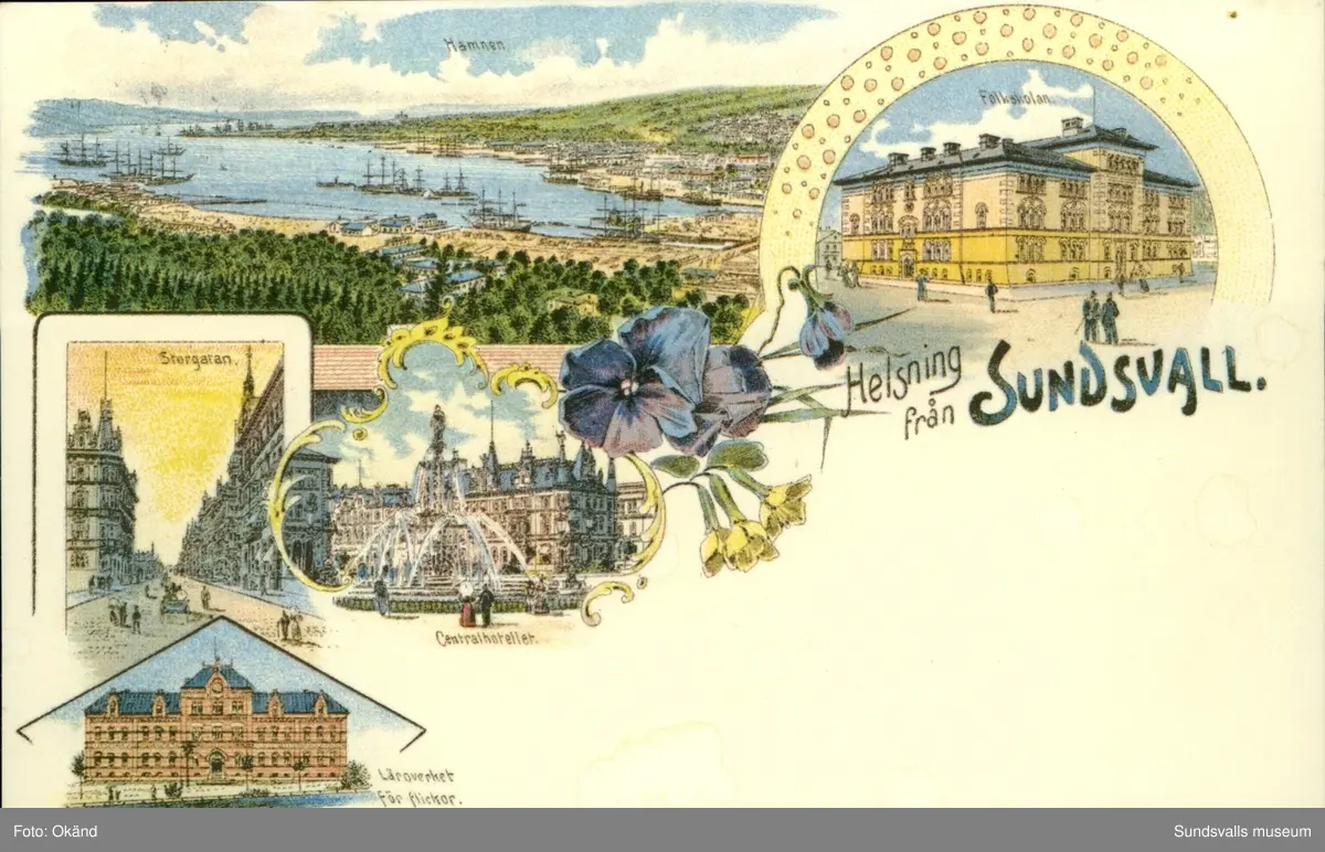Vykort med motiv över Hamnen, Folkskolan, Storgatan, Centralhotellet och Flickskolan i Sundsvall.