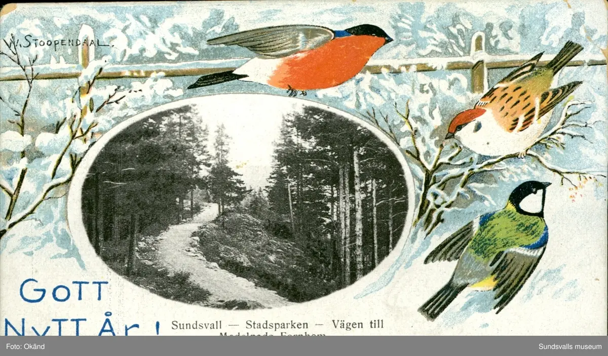 Vykort med motiv över Stadsparken med texten Gott Nytt År Sundsvall- Stadsparken- Vägen till Medelpads Fornhem.