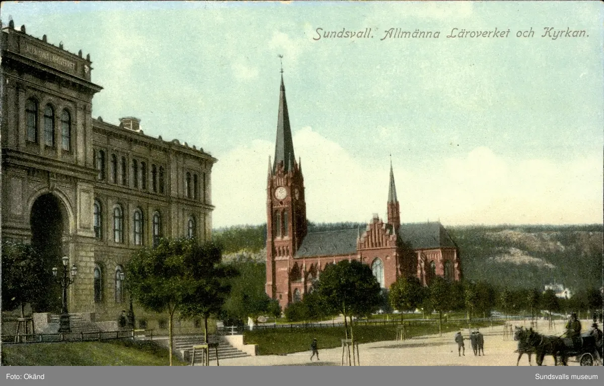 Vykort med motiv över Allmänna läroverket och Gustav Adolfs kyrka i Sundsvall.