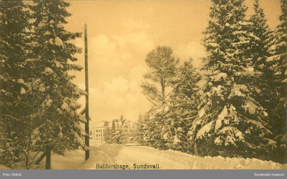 Vykort med vintermotiv över Baldershage i Sundsvall.