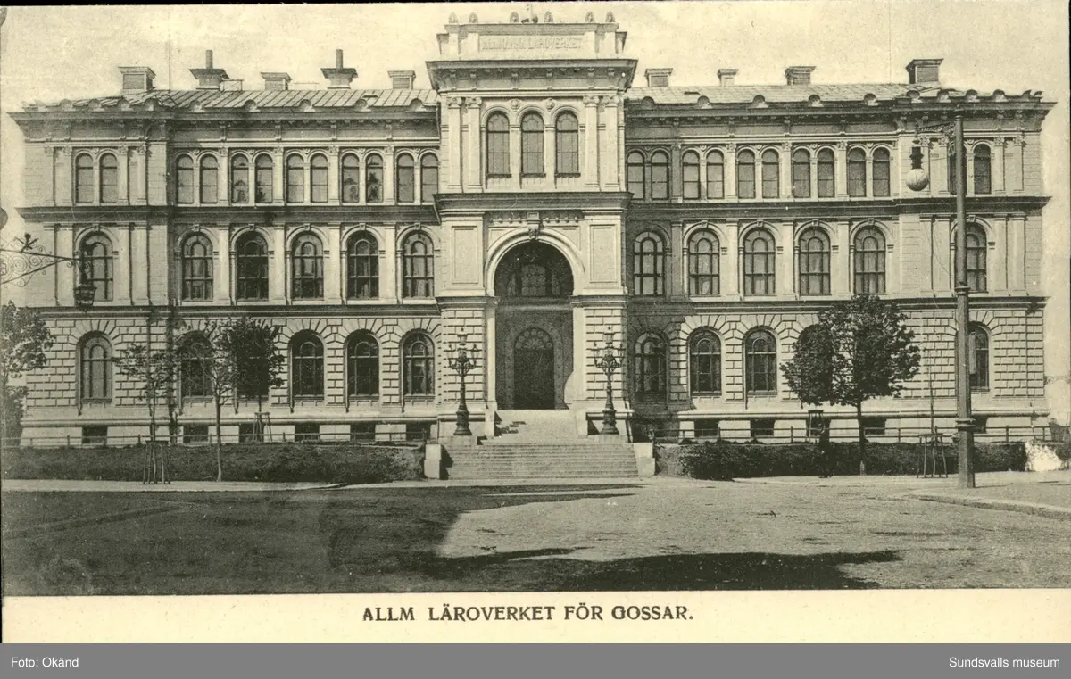 Vykort med motiv över Allmänna läroverket för gossar i Sundsvall.