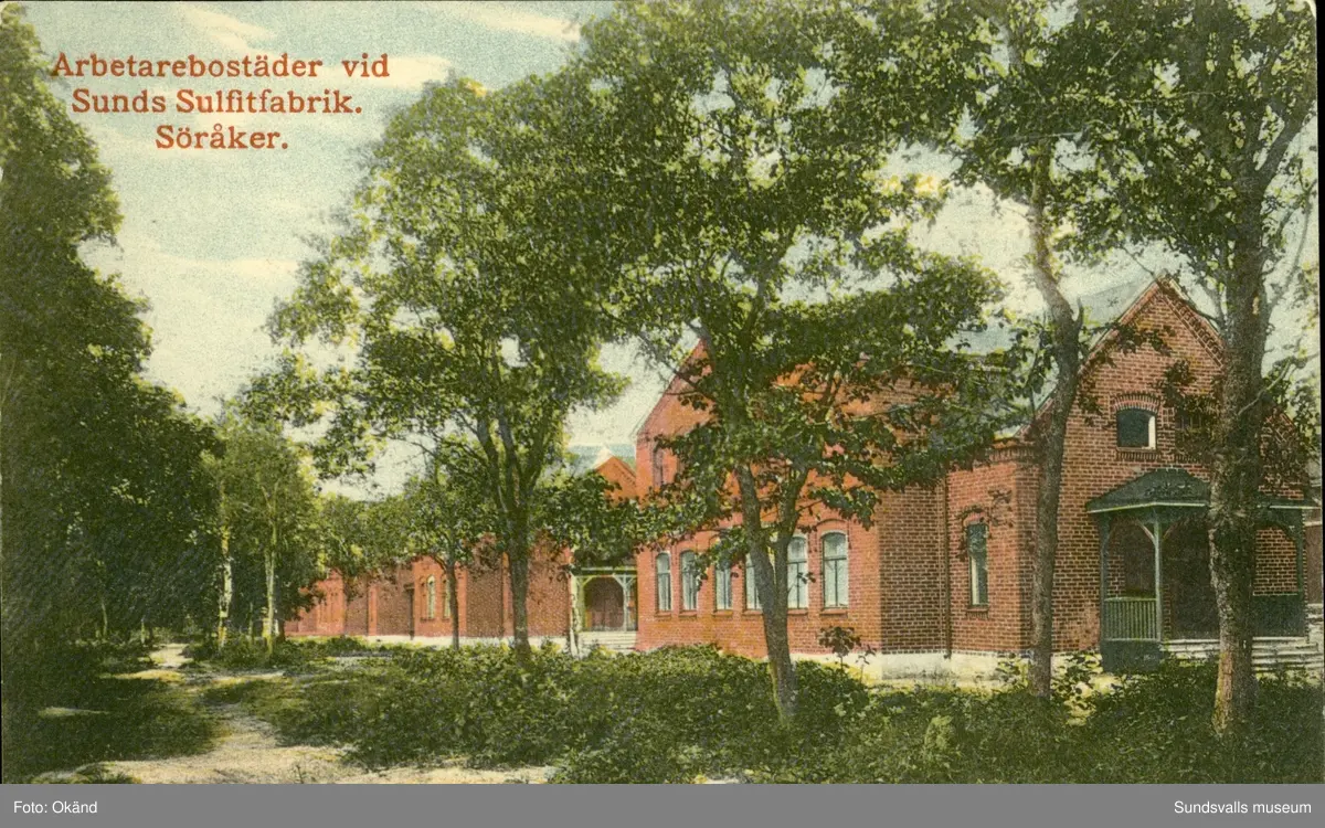 Vykort med motiv över arbetarbostäderna vid Sunds Sulfitfabrik i Söråker.