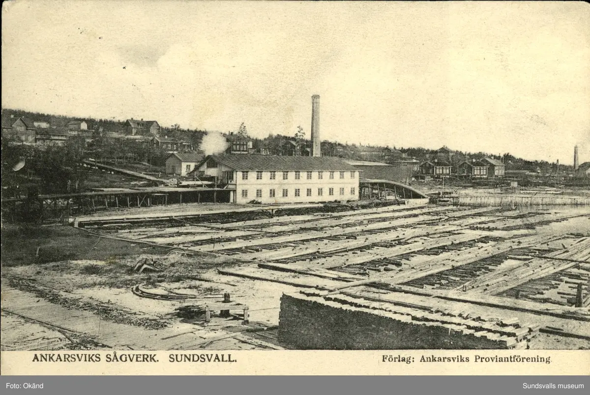 Vykort med motiv över Ankarsviks sågverk i Sundsvall.