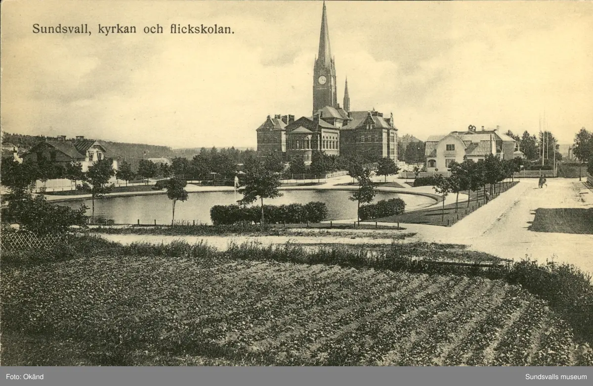 Vykort med motiv över Gustav Adolfs kyrka och Flickoskolan i Sundsvall.