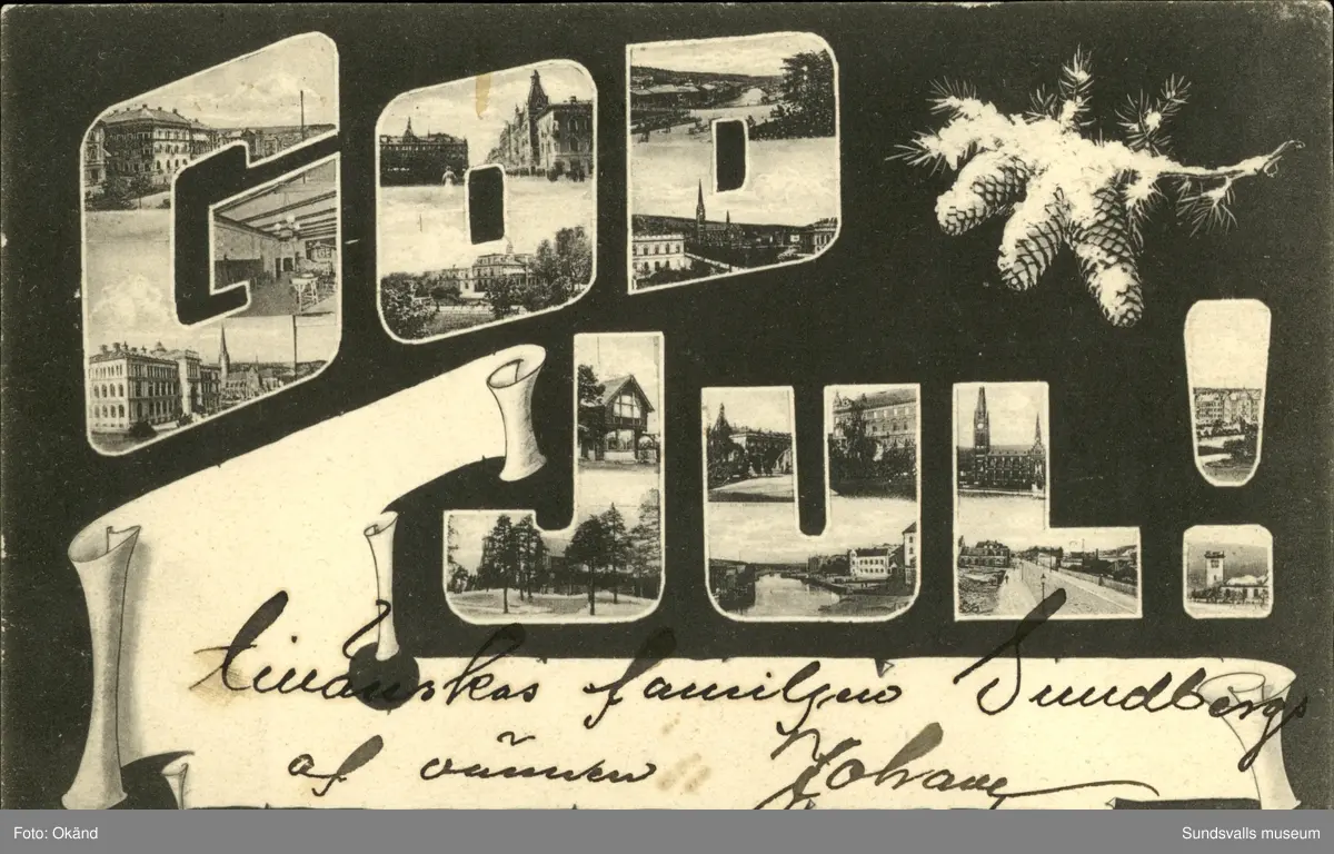 Vykort med texten God Jul i vilken det finns topografiska foton över Sundsvall.