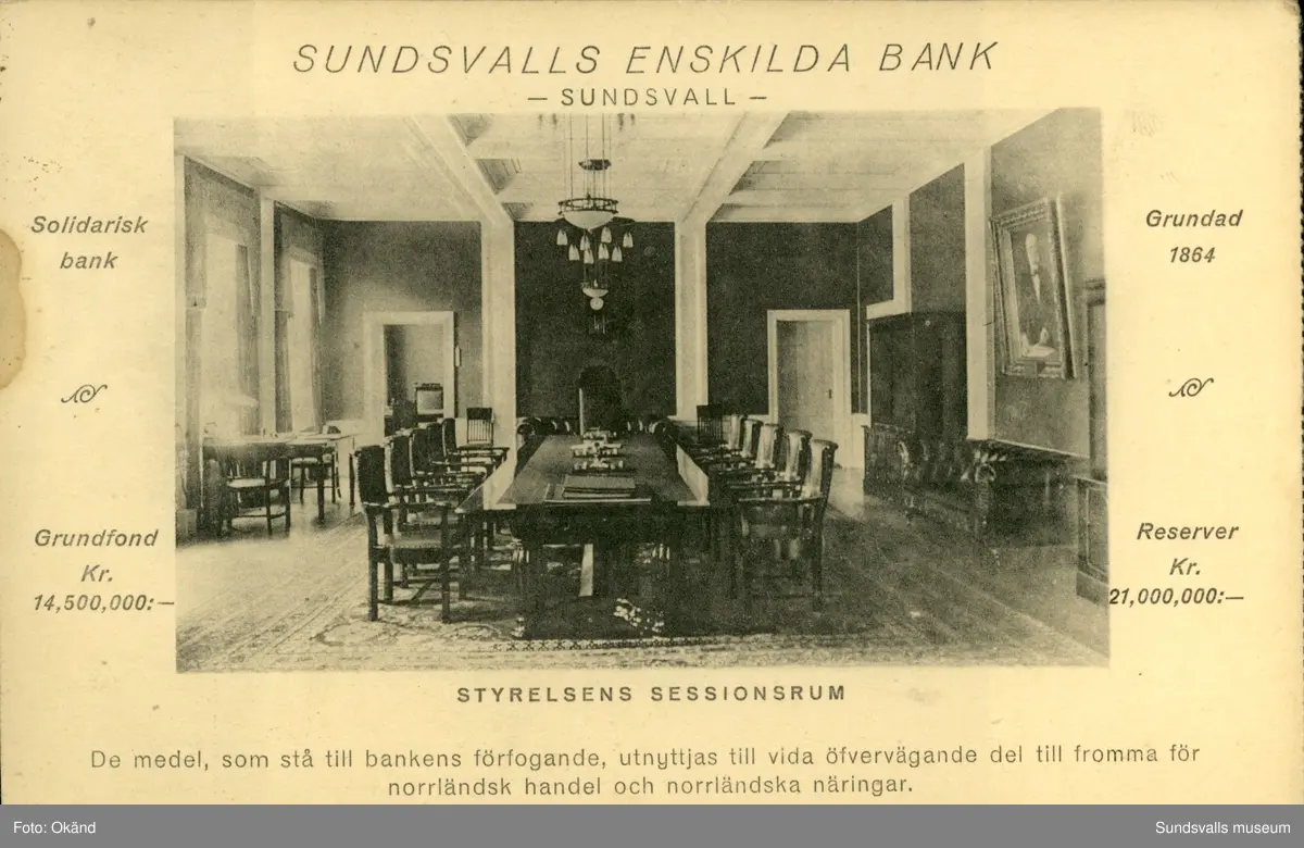 Vykort med motiv över Enskilda bankens styrelserum i Sundsvall.