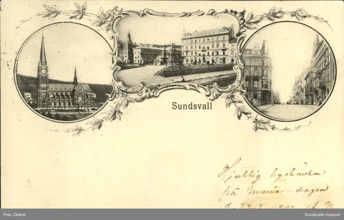 Vykort med motiv över Gustav Adolfs kyrka, Vängåvan och Storgatan i Sundsvall.