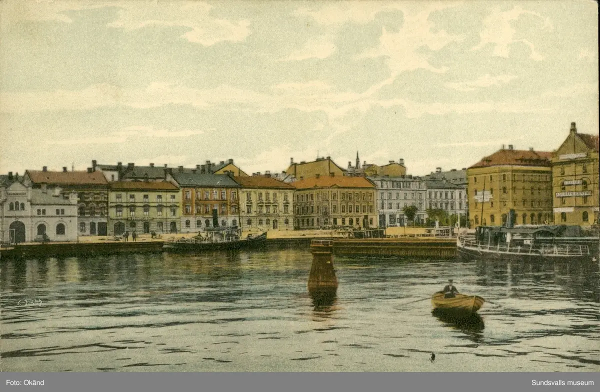 Vykort med motiv över Hamnen och Sjögatan i Sundsvall.