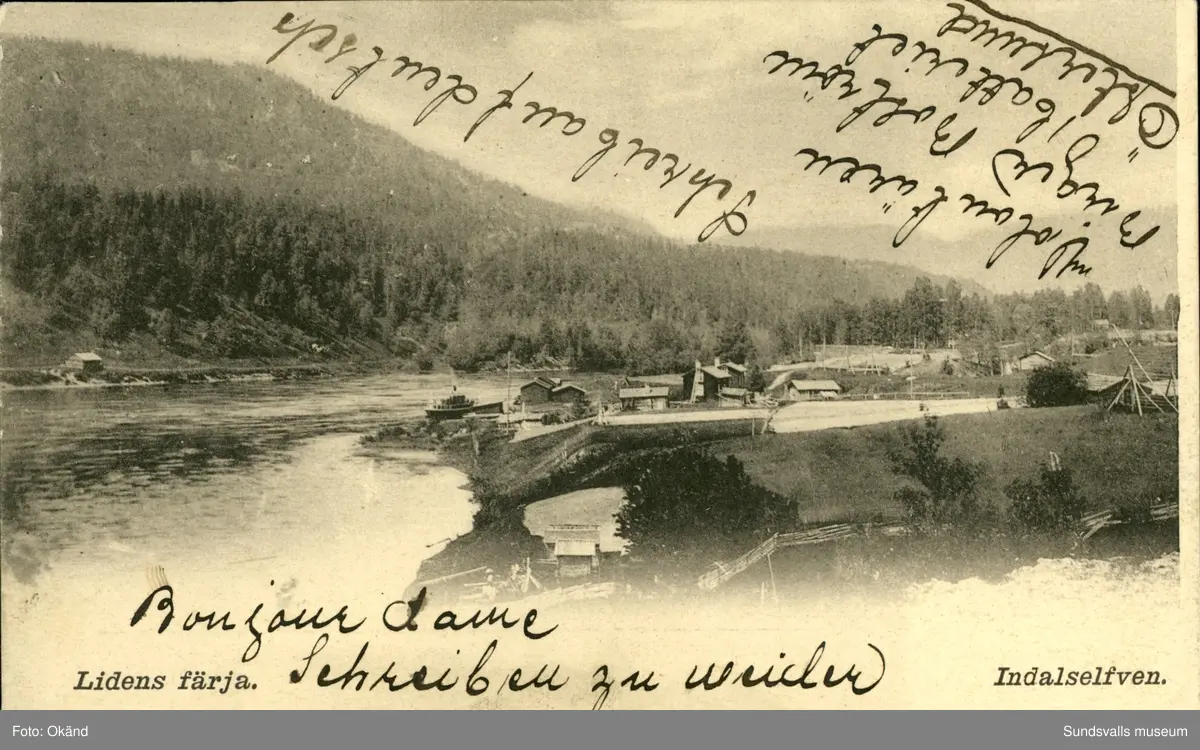 Vykort med motiv över Lidenfärja som trafikerade Indalsälven.