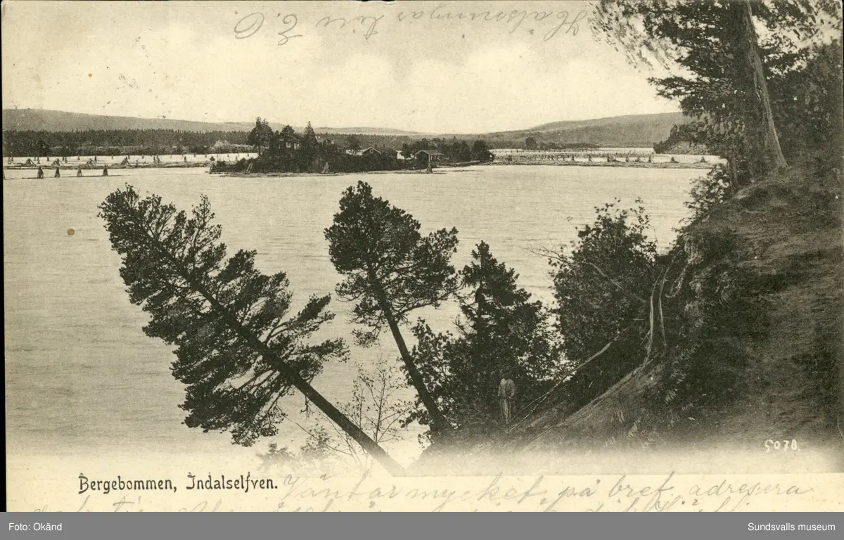 Vykort med motiv över Bergebommen i Indalsälven.