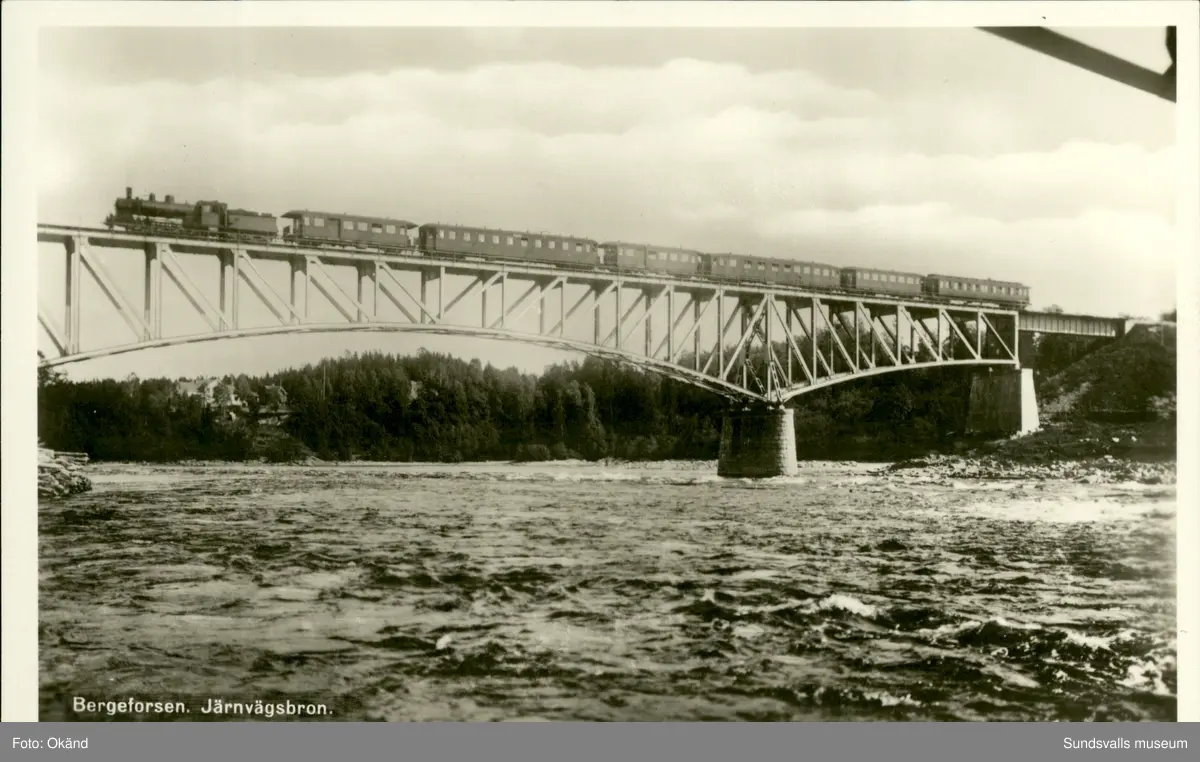 Vykort med motiv över järnvägsbron över Indalsälven i Bergeforsen.