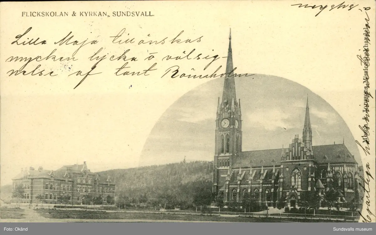 Vykort med motiv av flickskolan och kyrkan i Sundsvall.