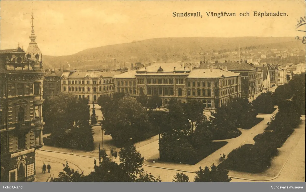 Vykort med motiv över Vängåvan och Esplanaden i Sundsvall.