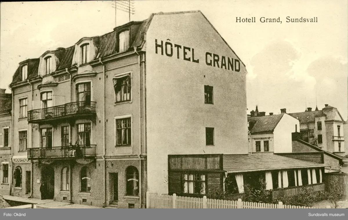 Vykort med motiv av Hotell Grand på Trädgårdsgatan 4 i Sundsvall.