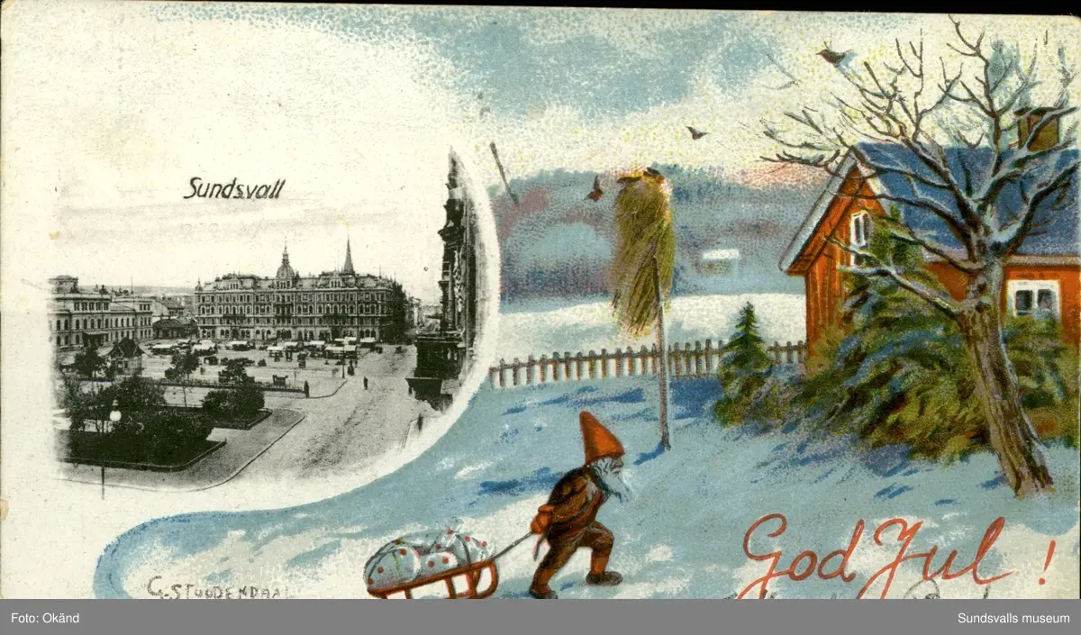 Vykort med motiv över Sundsvall och texten: God Jul!