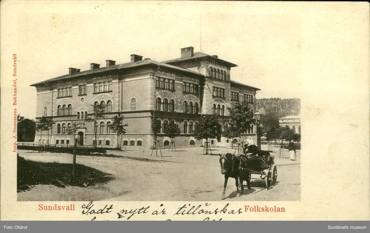 Vykort med motiv över Folkskolan i Sundsvall.