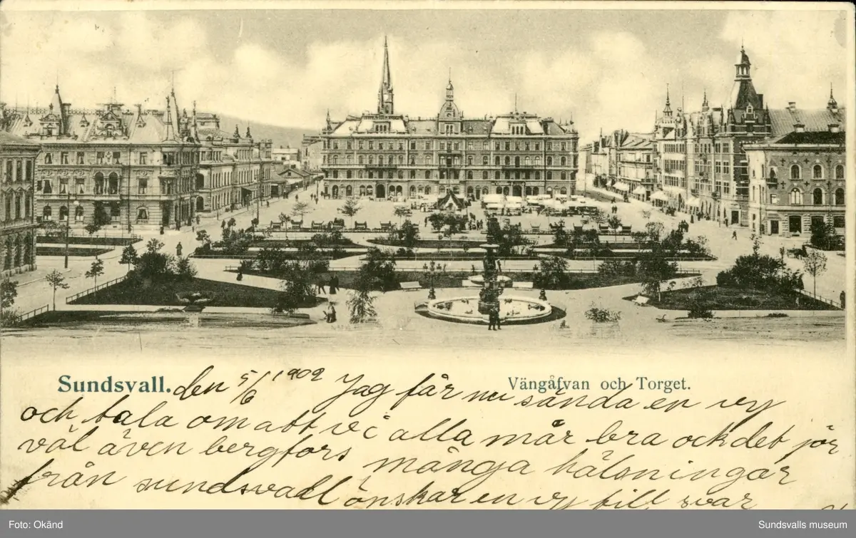 Vykort med motiv av Vängåvan och Stora Torget i Sundsvall.