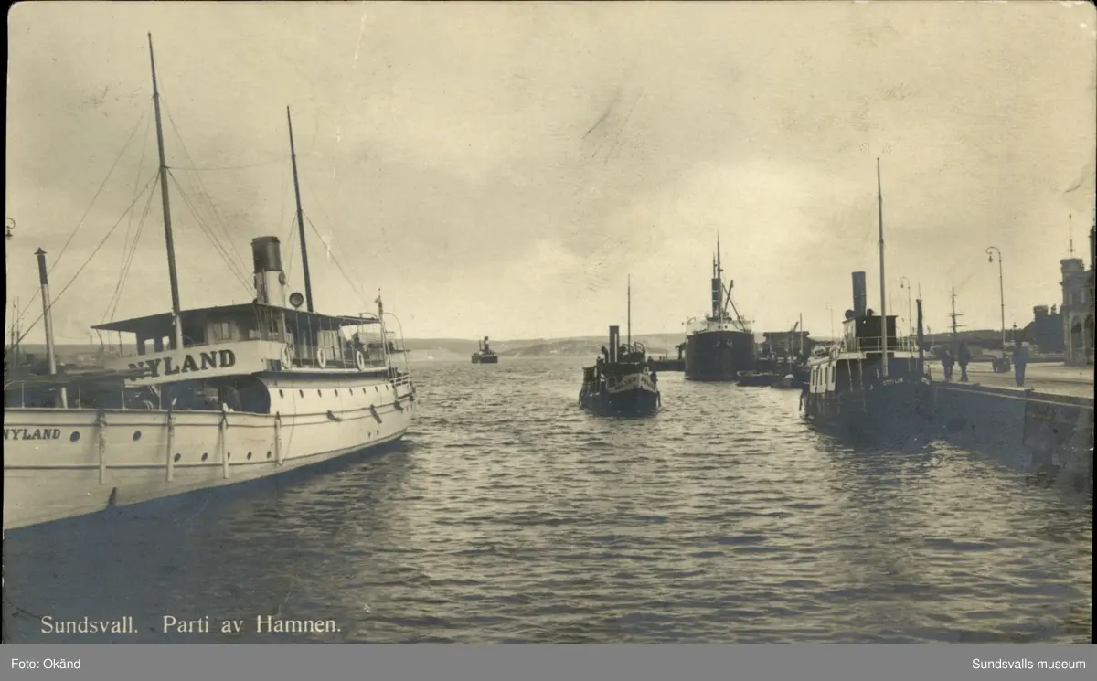 Vykort med motiv över ett parti av Hamnen i Sundsvall.