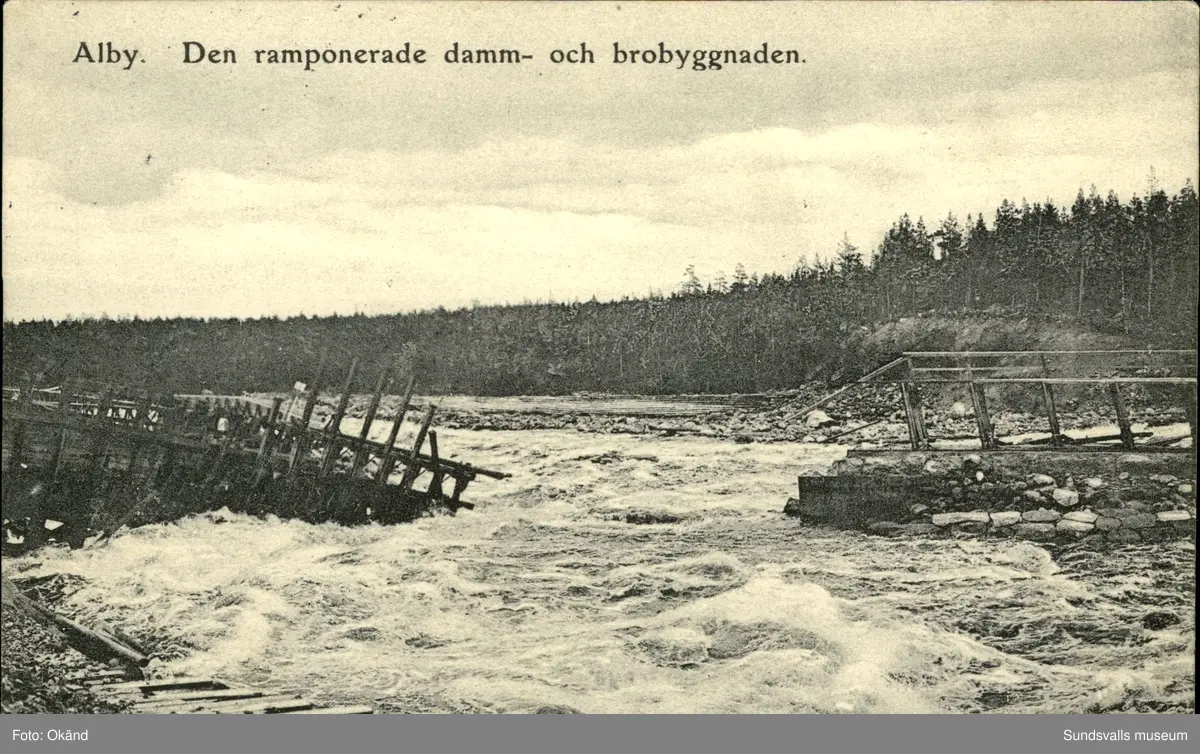 Vykort med motiv från Alby med texten: Den ramponerade damm- och brobyggnaden.