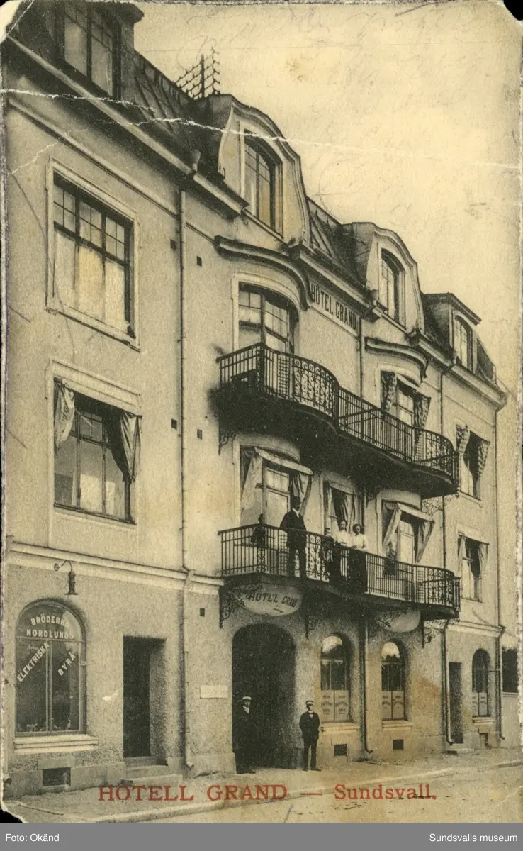 Vykort med motiv över Hotell Grand på Trädgårdsgatan 4 i Sundsvall.