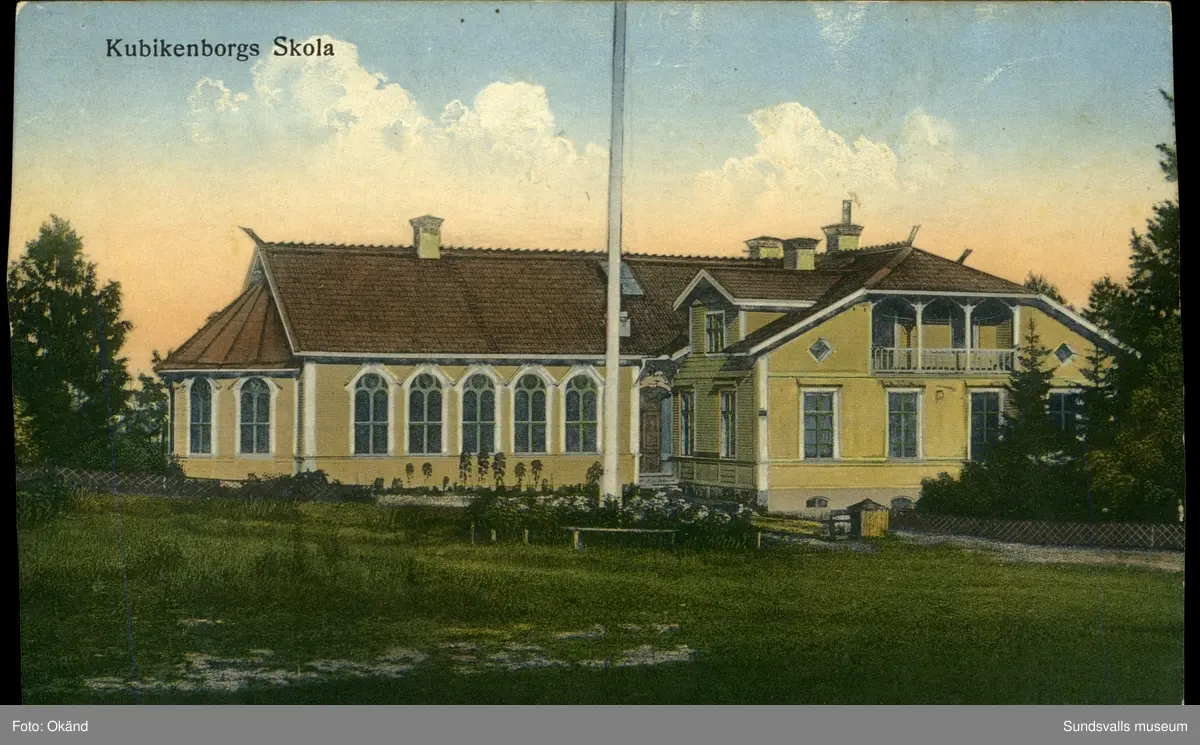 Vykort med motiv över Kubikenborgsskola i Sundsvall.