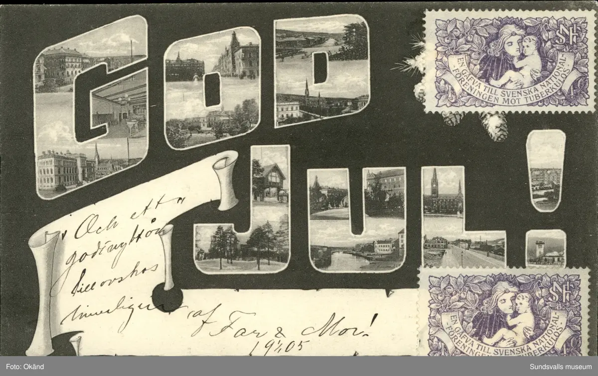 Vykort med texten God Jul i vilken det finns topografiska foton över Sundsvall.