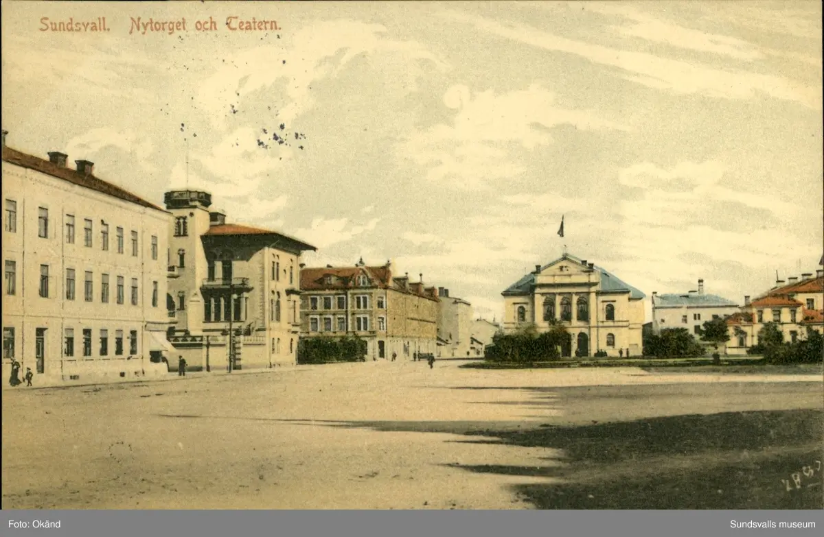 Vykort med motiv över Nytorget och Teatern i Sundsvall.