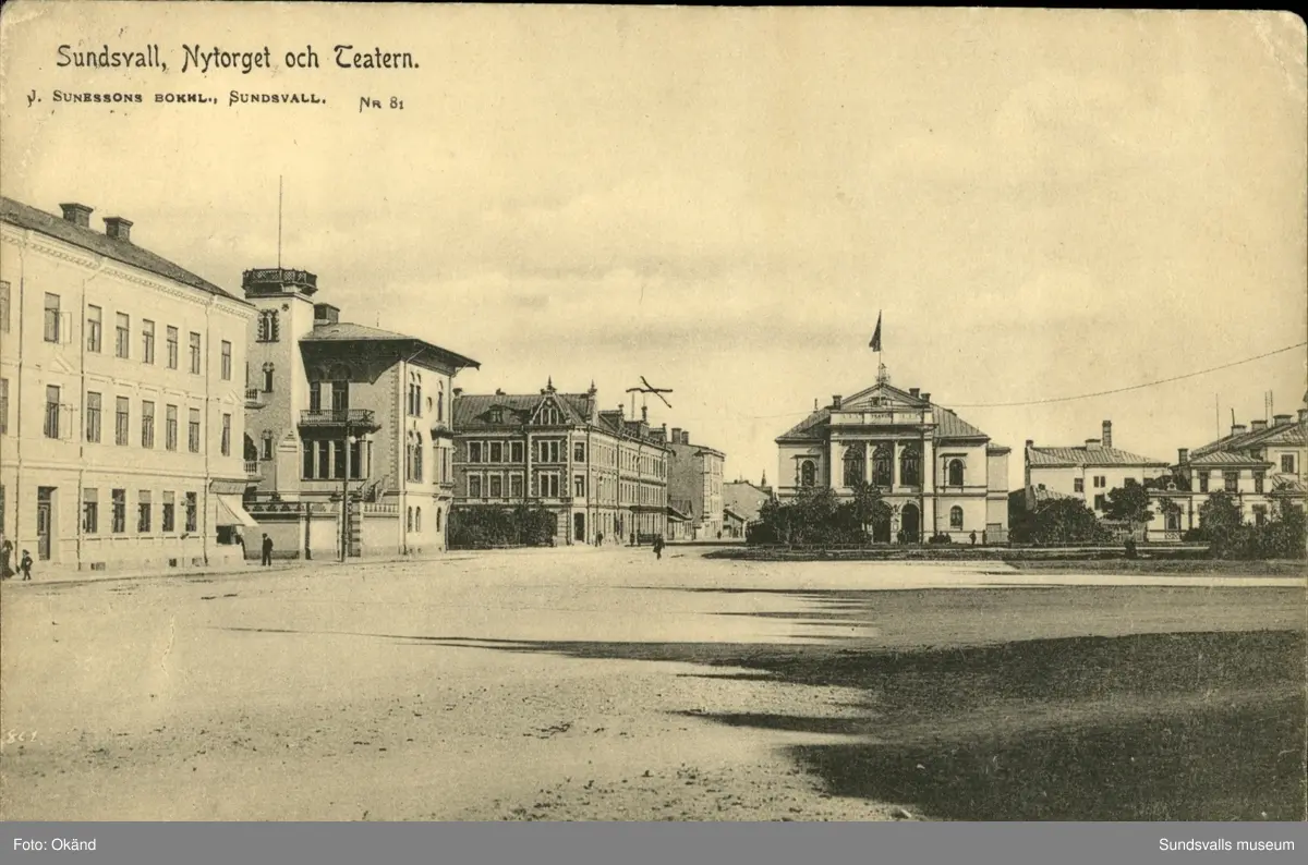 Vykort med motiv över Nytorget och Teatern i Sundsvall.