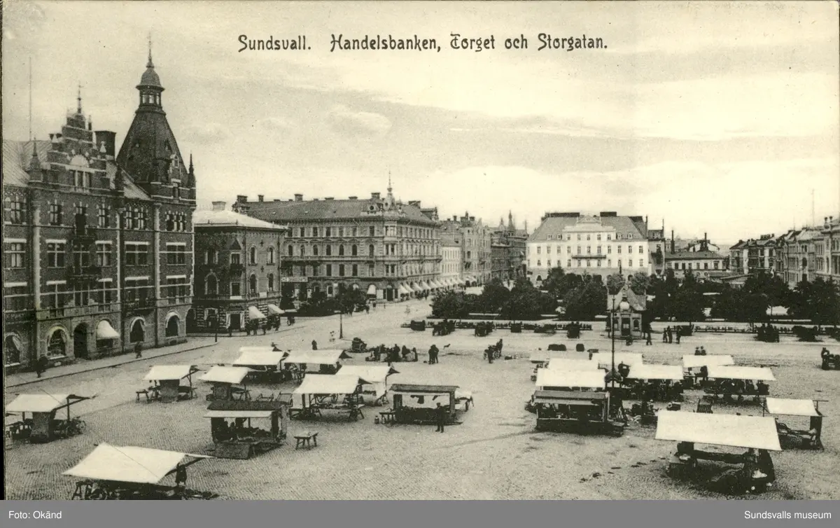 Vykort med motiv över Handelsbanken, Torget och Storgatan i Sundsvall.