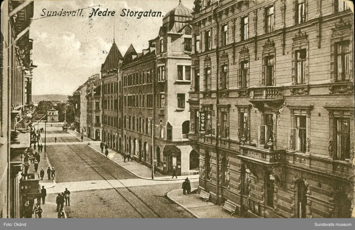 Vykort med motiv över Nedre Storgatan i Sundsvall.