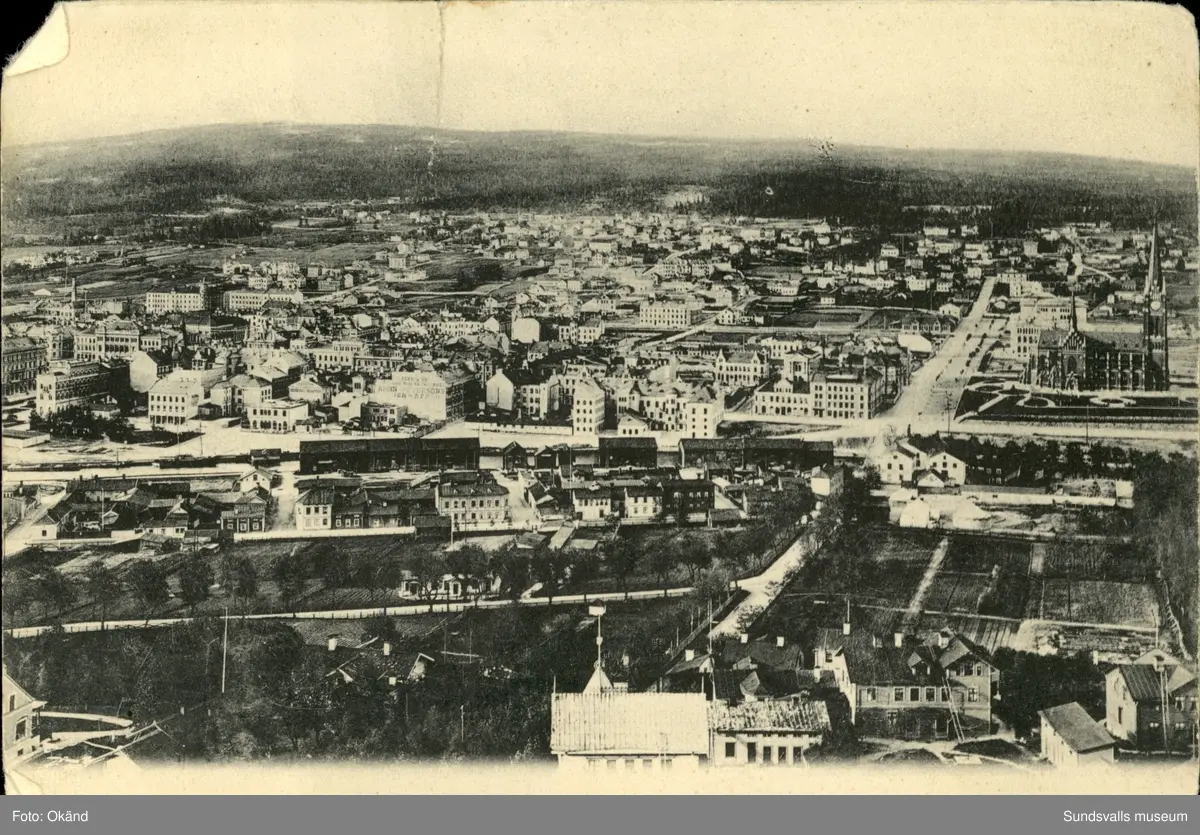 Vykort med motiv över Sundsvall i Panorama från Norra stadsberget.