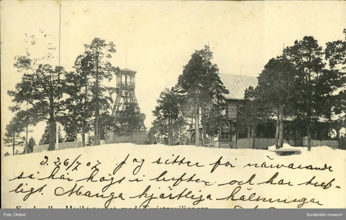 Vykort med motiv över Utsiktstornet och Turistpaviljongen i Sundsvall.