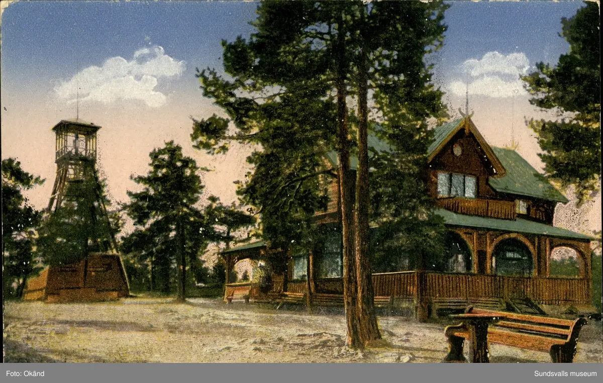 Vykort med motiv över Turistpaviljongen och Utsikstornet i Sundsvall.