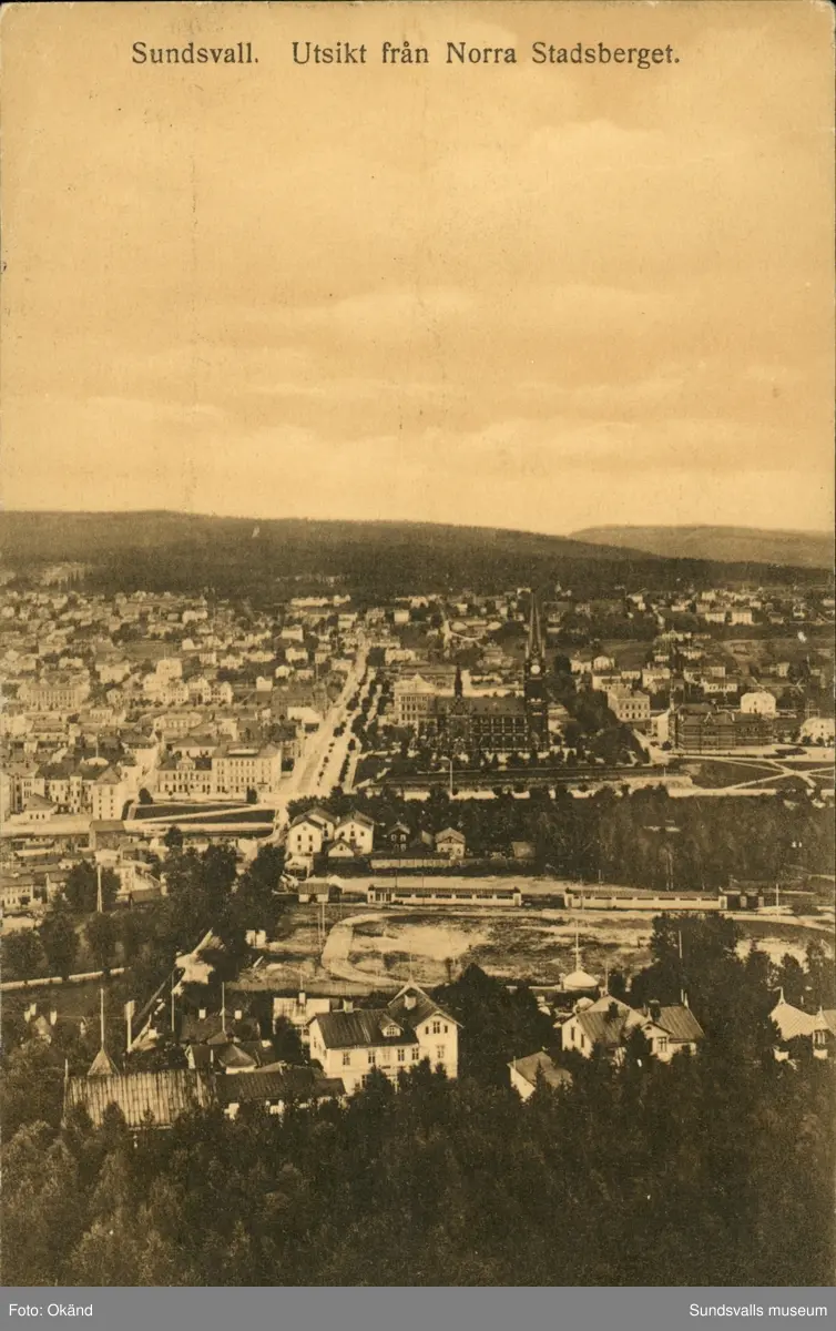 Titel: Vykort med motiv över Sundsvall och Gustav Adolfskyrka sett från Norra berget.