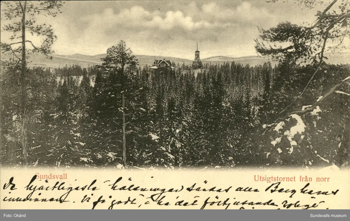 Vykort med motiv över Turistpaviljongen och Utsiktstornet i Sundsvall.