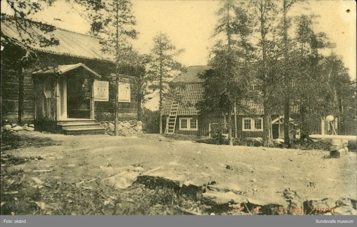 Vykort med motiv över Bredsjöstugan och trampmangeln på Norra Stadsberget i Sundsvall.