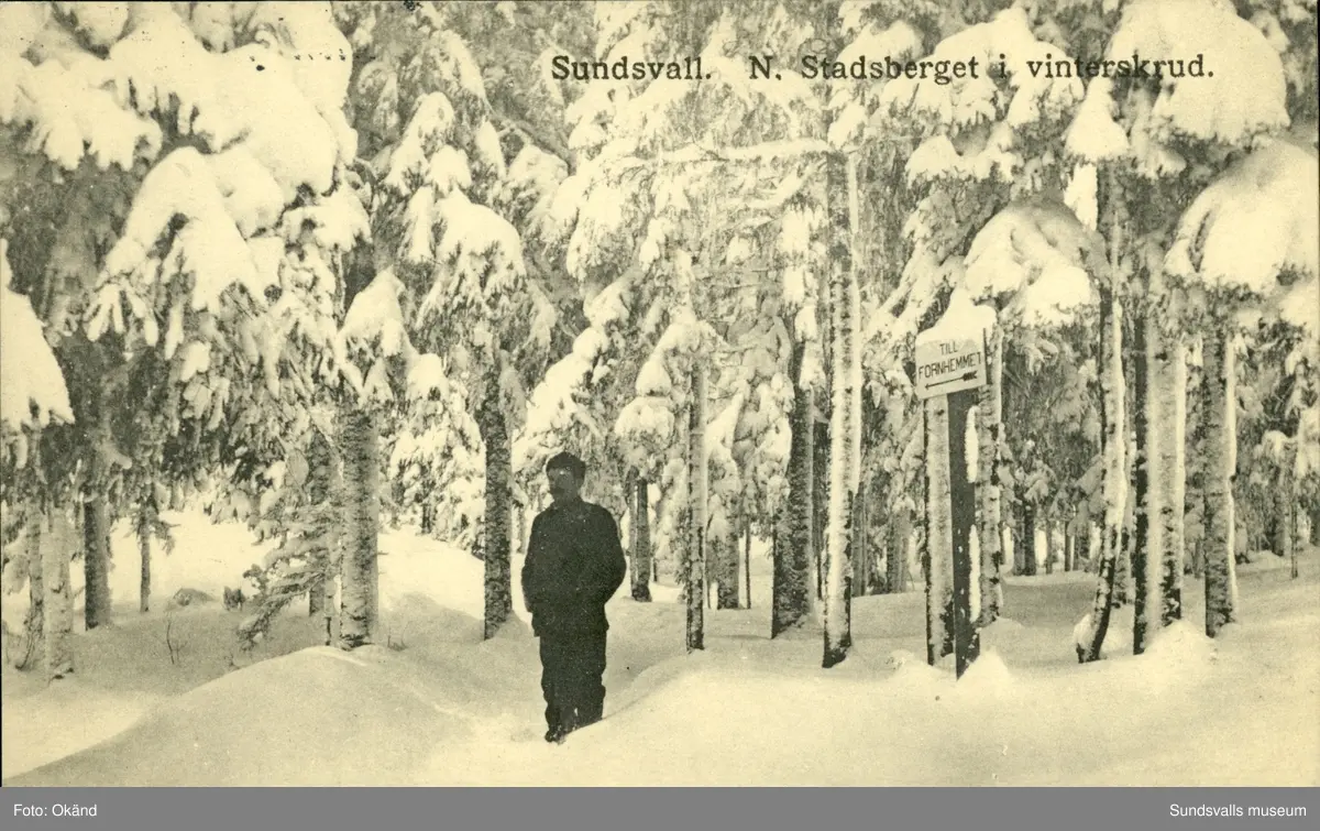 Vykort med motiv över Norra Stadsberget i vinterskrud.