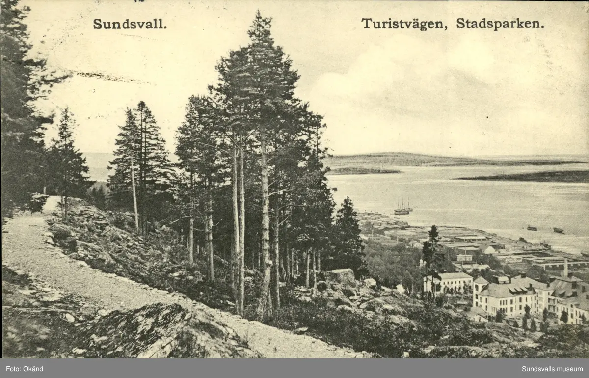 Vykort med motiv över Hamnen i Sundsvall från Turistvägen.