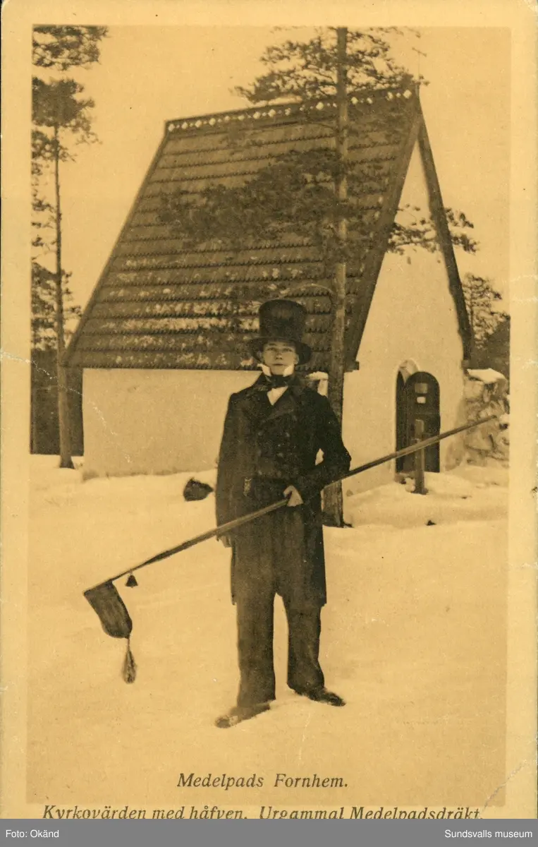 Vykort med motiv över Medelpads fornhems kyrka på Norra Stadsberget i Sundsvall. Med texten: Kyrkovärden med håfven. Urgammal Medelpadsdräkt.