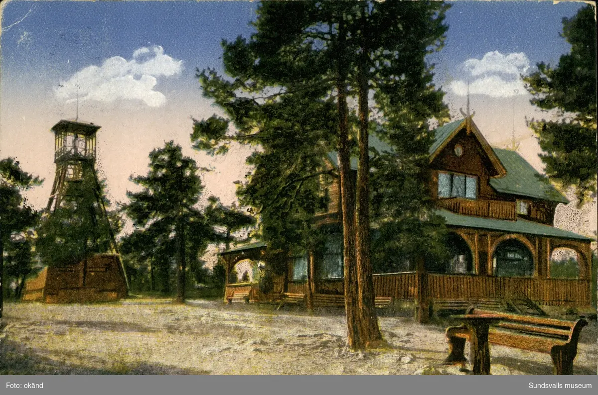 Vykort med motiv över Utsiktstornet och Turistpaviljongen i Sundsvall.