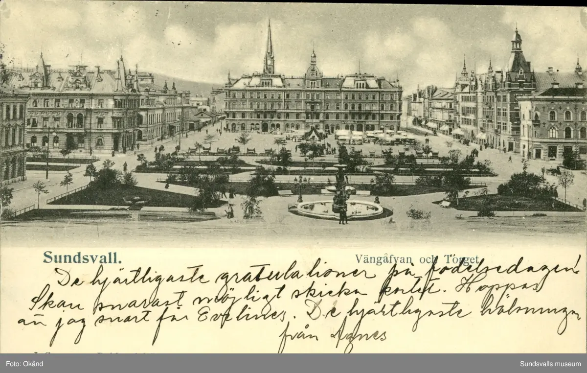 Vykort med motiv över Vängåvan och Stora torget i Sundsvall.