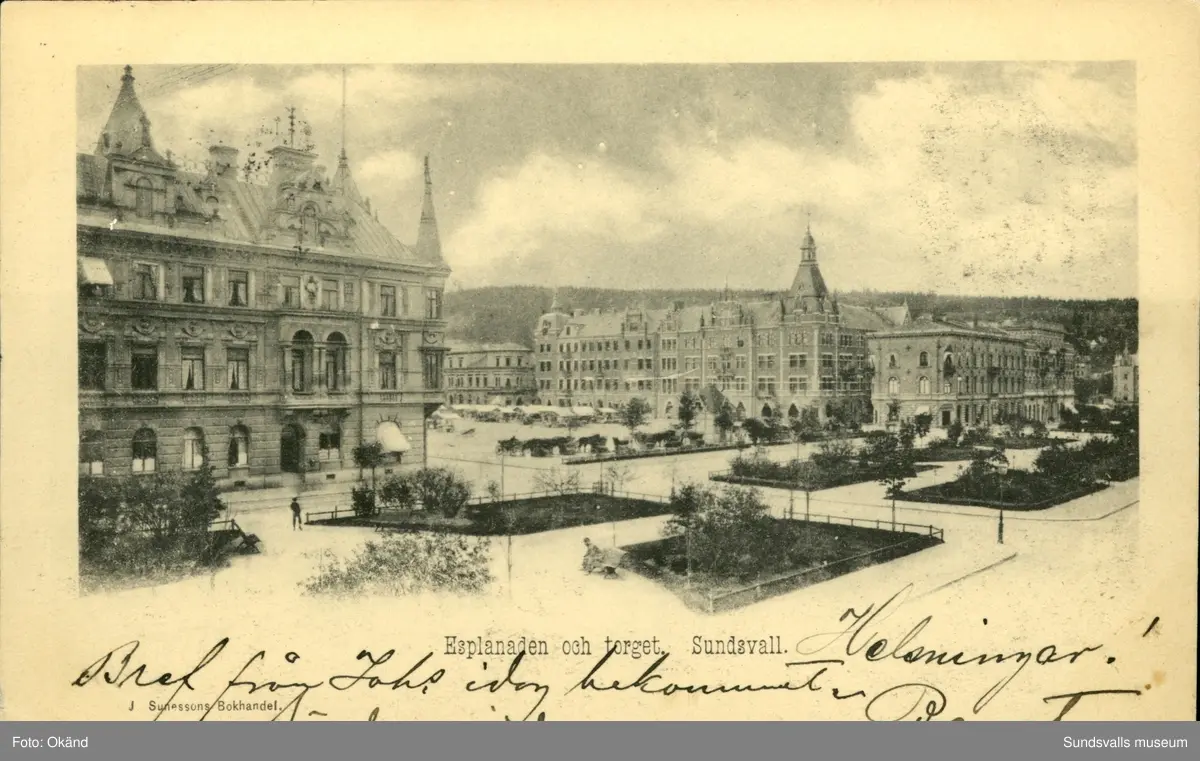 Vykort med motiv över Esplanaden och torget i Sundsvall.