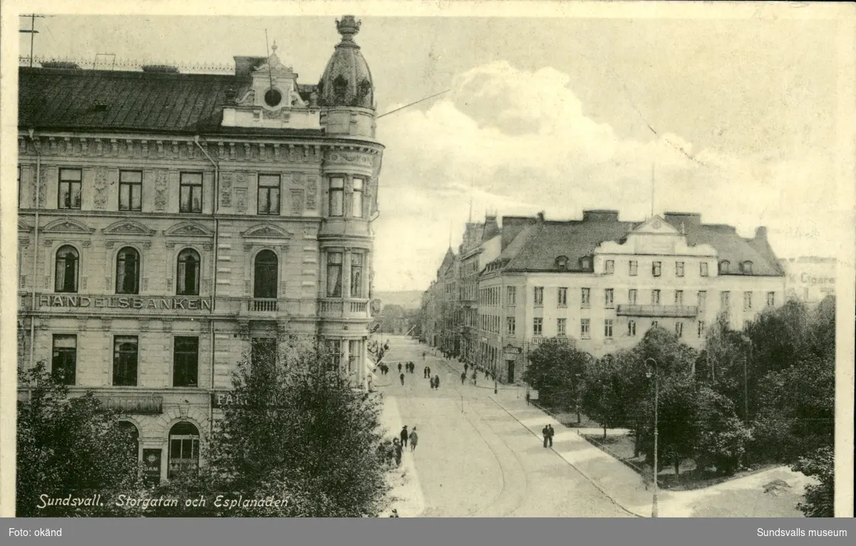 Vykort med motiv över Storgatan och Esplanaden i Sundsvall.