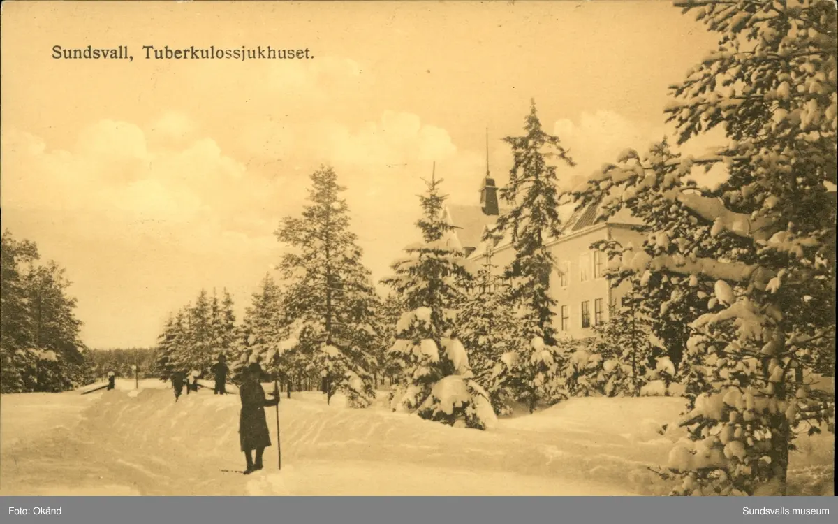 Vykort med vintermotiv vid Medelpads Tuberkulossjukhus i Sundsvall.