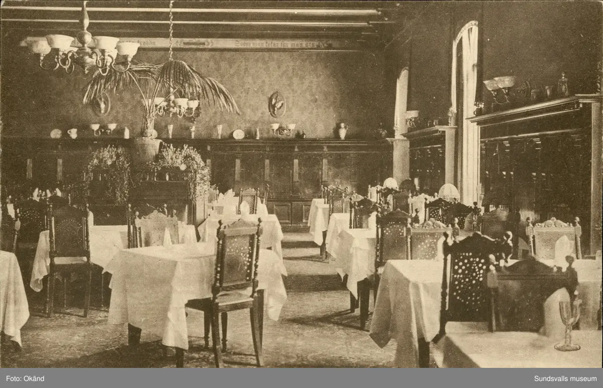 Vykort med motiv över interiören i matsalen vid Hotell Knaust i Sundsvall.
