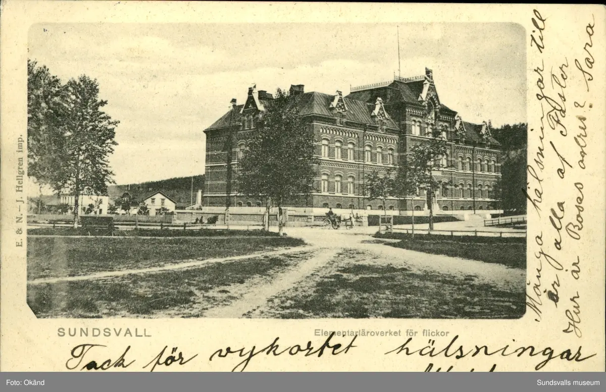 Vykort med motiv över Elementärverket för flickor i Sundsvall.