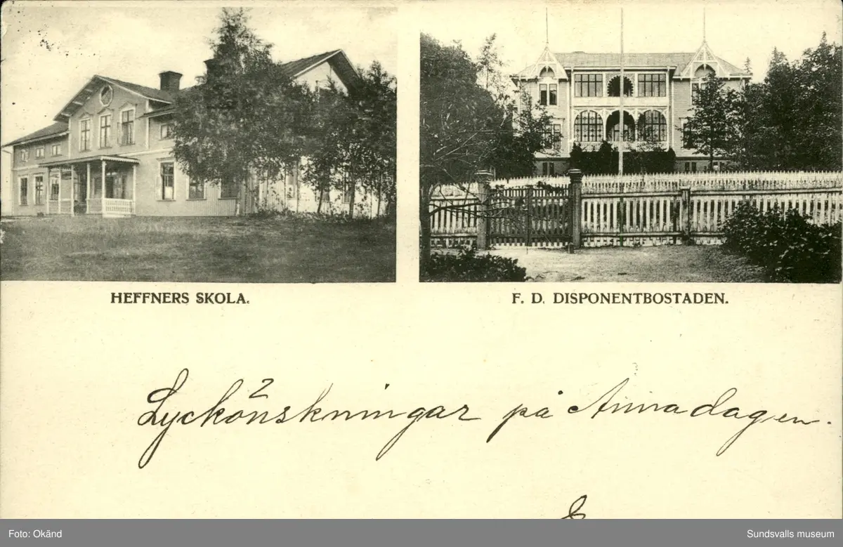 Vykort med motiv över skolan och den f.d disponentbostaden vid Heffners i Sundsvall.