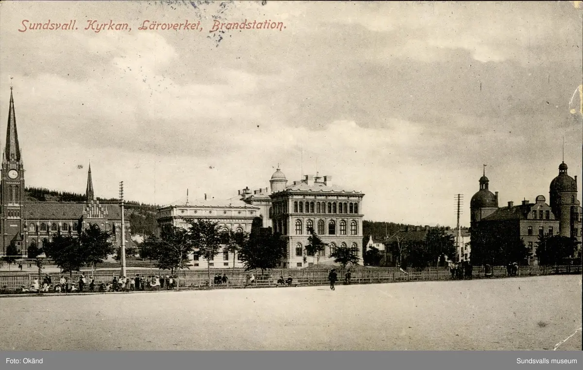 Vykort med motiv över kyrkan, läroverket och brandstationen i Sundsvall.